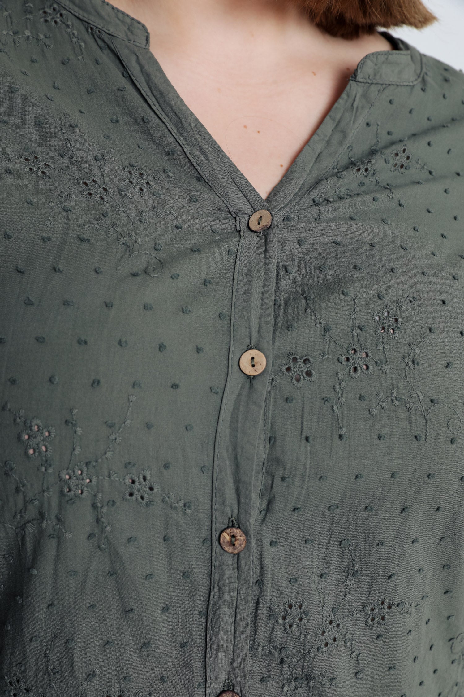 Ontdek deze elegante katoenen blouse met lange mouwen, gemaakt van 100% katoen voor optimaal draagcomfort. De blouse is voorzien van verfijnde borduursels en een stijlvolle plumetis structuur, gecombineerd met een flatterende V-hals en knoopsluiting. Met een lengte van 76 cm bij maat 48 biedt deze blouse een perfecte pasvorm. Kies uw gebruikelijke maat en straal in deze tijdloze must-have.