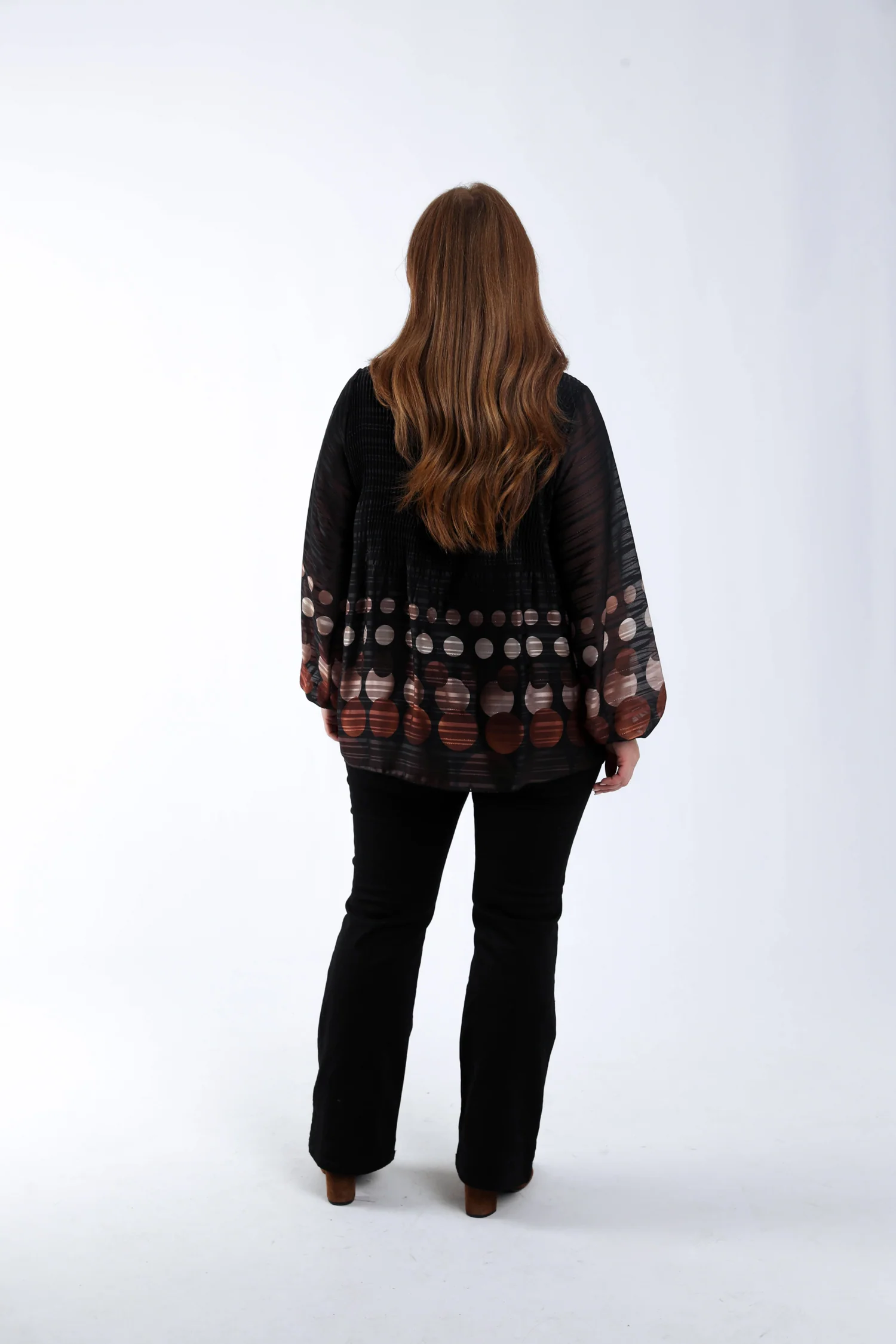 Ontdek de elegante plissé blouse met een speelse print van ronde cirkels. Deze blouse valt op door zijn gevulde stof en lange mouwen met elastische manchetten, die zorgen voor comfort en stijl. De ronde hals en een lengte van 75 cm bij maat 48 maken het een veelzijdig kledingstuk. Kies uw gebruikelijke maat voor een perfecte pasvorm.