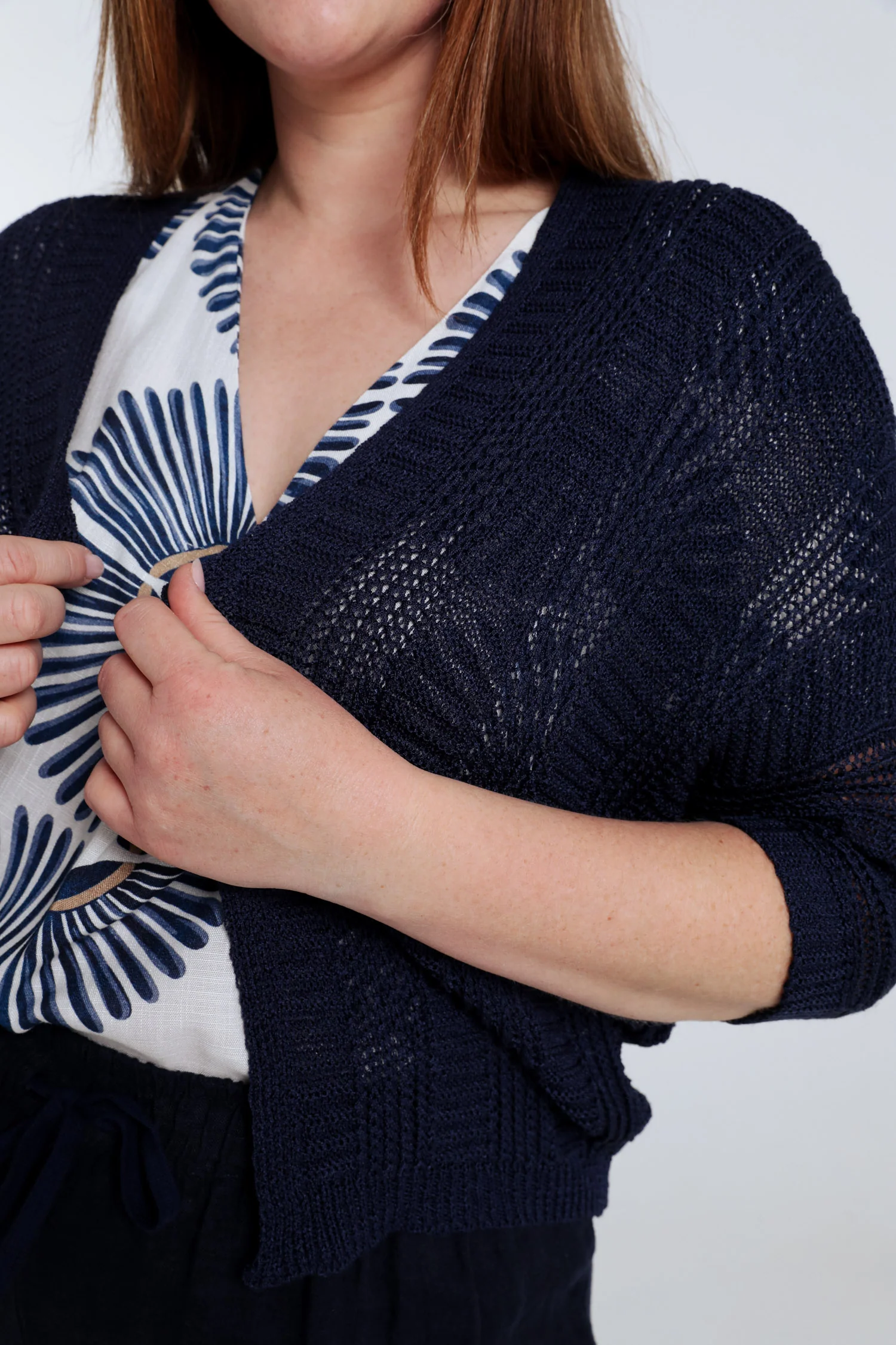 Ontdek dit effen opengewerkt vest met korte giletstijl en driekwart mouwen. Zonder sluiting en met een lengte van 60 cm (maat 48) biedt het een luchtige en stijlvolle laag. Perfect voor een casual en toch verfijnde look. Kies uw gebruikelijke maat voor optimaal comfort en draagplezier.