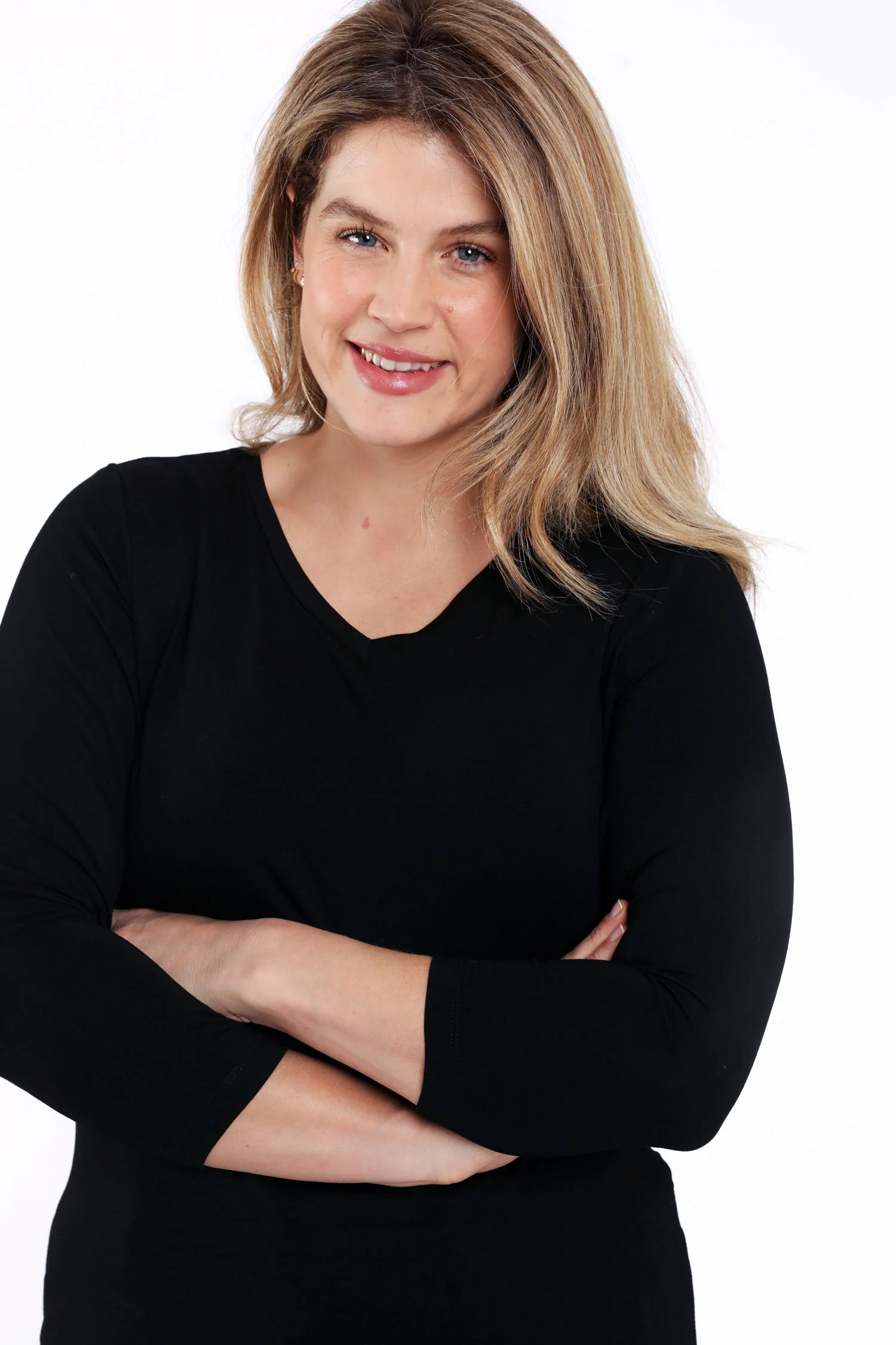 Ontdek het basic T-shirt van viscose met een comfortabele V-hals en 3/4 mouwen. Dit effen shirt combineert stijl en draagcomfort dankzij de zachte, ademende stof. Met een lengte van 69 cm (maat 48) is het perfect voor elke casual look. Twijfel je tussen twee maten? Kies dan gerust de grotere voor de ideale pasvorm. Een must-have basisitem voor je garderobe!