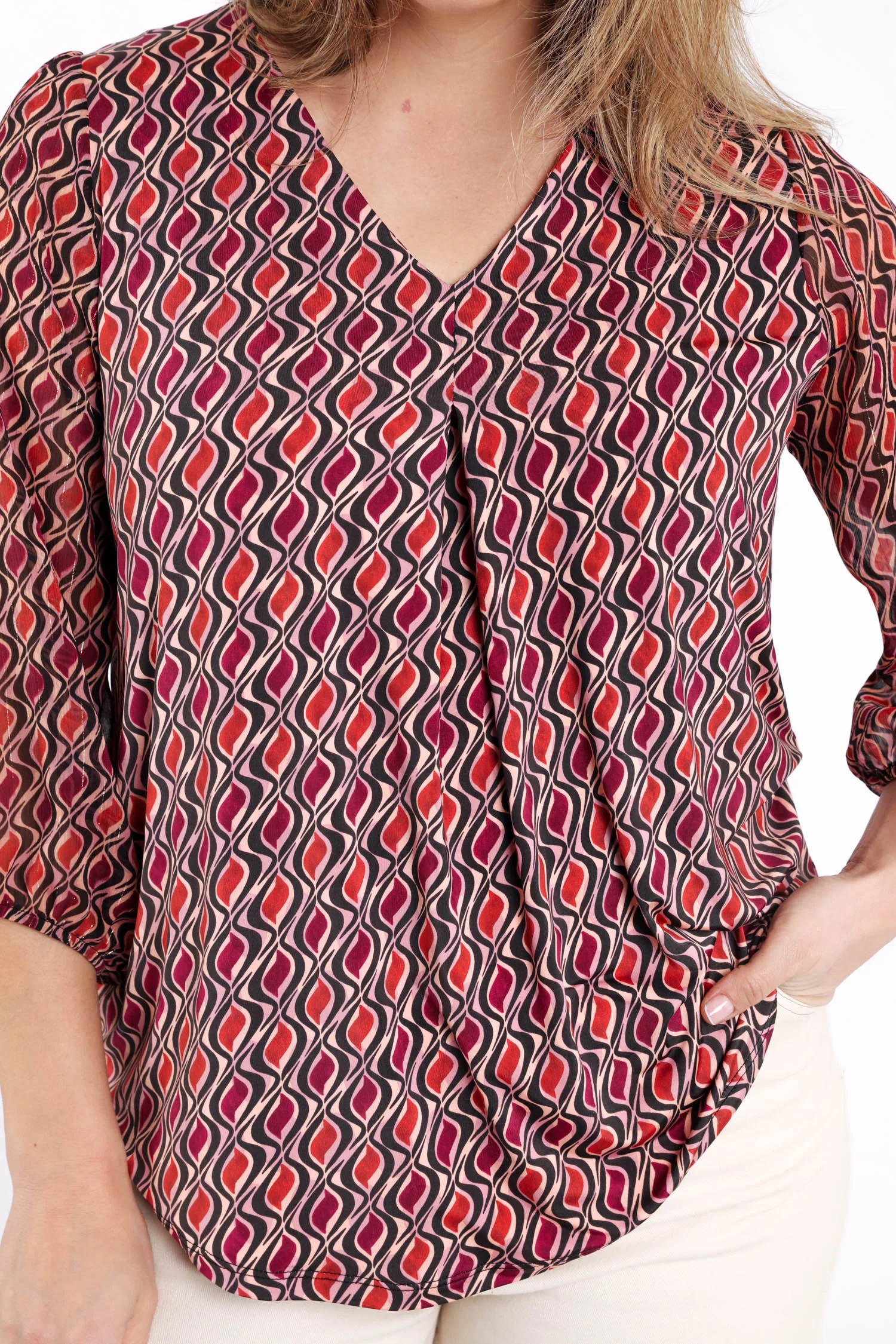 Ontdek dit stijlvolle T-shirt van voile met een opvallende grafische print en subtiele lurex details. Met 3/4-mouwen en elastische manchetten biedt het comfort en een perfecte pasvorm. De elegante V-hals en een lengte van 73 cm bij maat 48 maken het een veelzijdige toevoeging aan je garderobe. Kies je gebruikelijke maat voor een moeiteloze look.